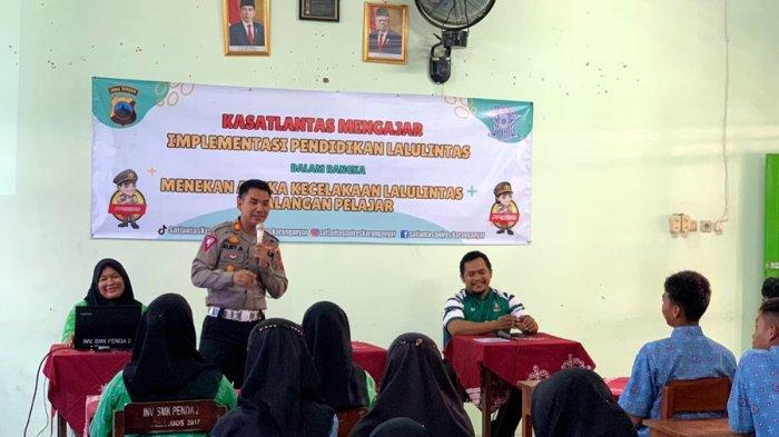 Anggota Satlantas sosialisasikan tertib berlalu lintas guna mengantisipasi dan menekan angka kecelakaan lalu lintas kepada siswa SMK di Karanganyar.